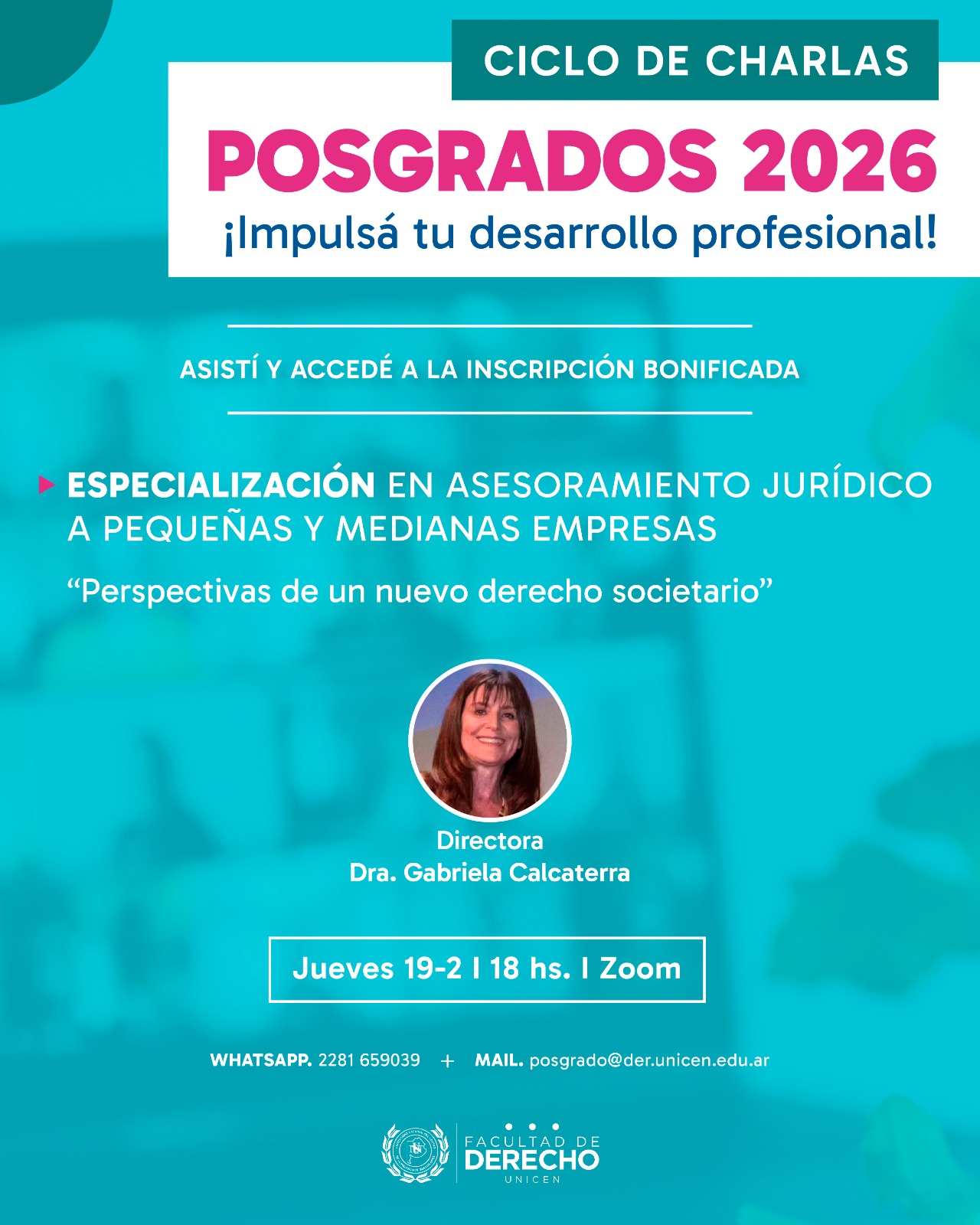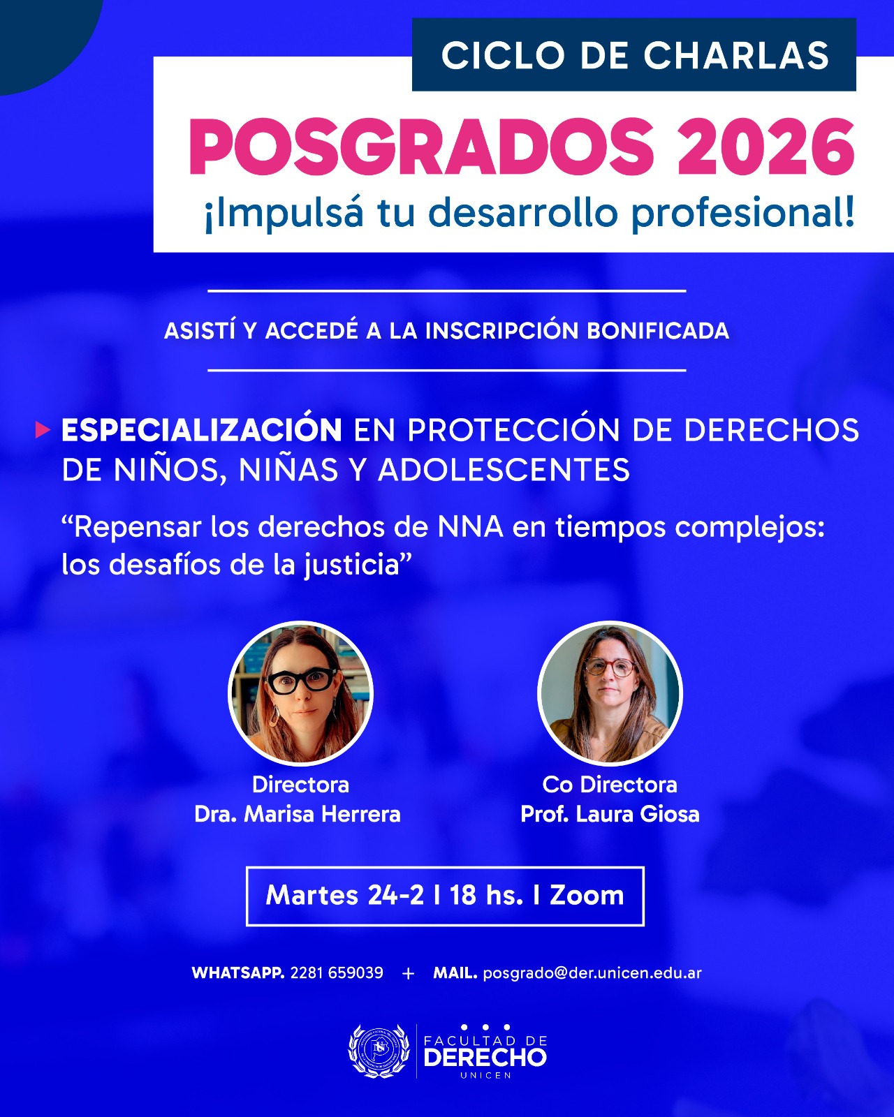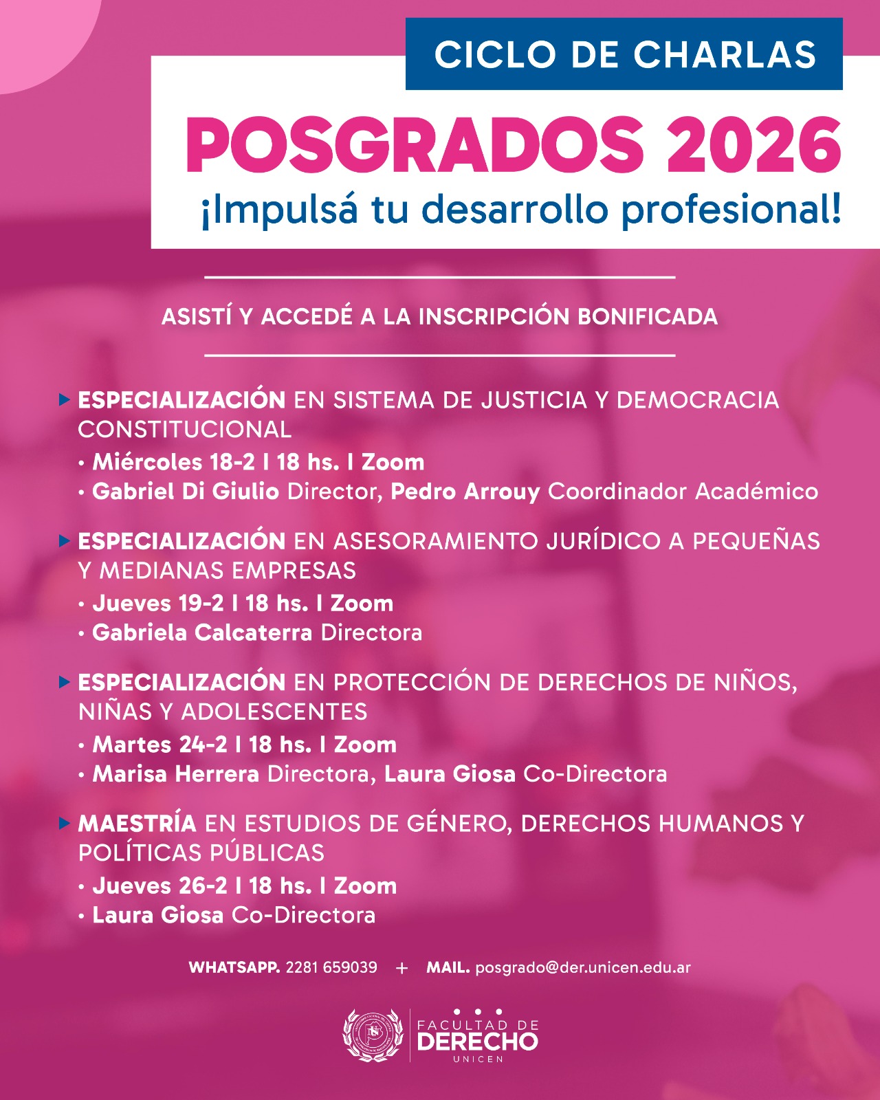 La Facultad de Derecho invita a profesionales y personas interesadas en continuar su formación académica a participar del Ciclo de Charlas Informativas sobre las propuestas de posgrado 2026, un espacio pensado para conocer en detalle cada programa y dialogar directamente con los equipos académicos responsables.